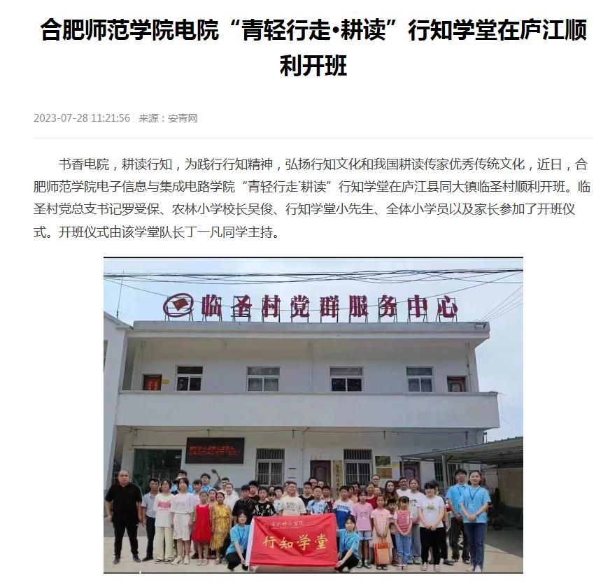 本网讯 7月28日,安青网以《Beat365亚洲版官网入口电院“青轻行走·耕读”行知学堂在庐江顺利开班》为题对Beat365亚洲版官网入口合肥市庐江县同大镇临圣村“行知学堂”进行了报道。