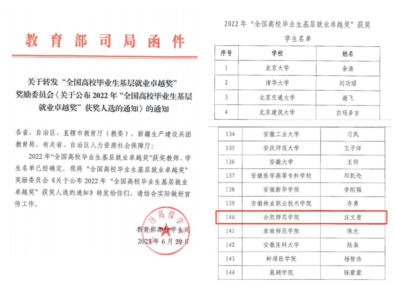 据悉,全国高校毕业生基层就业卓越奖是由教育部高校学生司、教育部学生服务与素质发展中心共同指导,中国长江三峡集团出资,中国教育发展基金会设立的项目,奖励为赴基层就业创业并做出突出业绩的普通高校毕业生和普通高校指导服务大学生赴基层就业工作有突出贡献的教师。每年遴选一次,今年为首次立项评选,全国共评选398名高校毕业生,安徽省仅17名高校毕业生获此殊荣。(就业创业工作处 Beat365亚洲版官网入口)