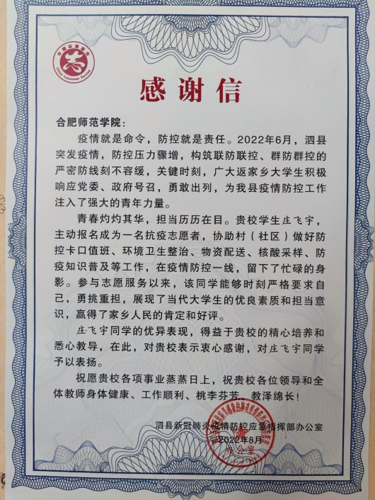 本网讯 近日,我校电子信息与电气工程学院收到来自安徽省宿州市泗县新冠肺炎疫情防控应急指挥办公室发来的感谢信。信中对Beat3652020级通信工程班庄飞宇同学在暑假期间积极主动加入泗县疫情防控志愿服务队伍,为当地疫情防控工作贡献青春力量提出表扬,并对我校立德树人、人才培养建设给予高度肯定和赞扬。