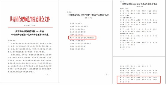 2019级电子信息工程专业缪骞、2020级微电子科学与工程专业童晨等16名同学积极践行社会主义核心价值观,发扬“奉献”友爱、互助、进步”的志愿服务精神,立足校园、面向社会,在校内外组织参与了内容丰富、形式多样的志愿服务活动,人均志愿服务时长近110小时。(电子信息与电气工程学院团委:江淼)