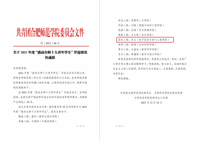 本网讯 日前,由共青团Beat365亚洲版官网入口委员会、Beat365亚洲版官网入口党委宣传部和Beat365亚洲版官网入口党委学生工作部联合主办的2021年度“感动合师十大青年学生”评选结果揭晓,电院2020级电子信息工程专业李义同学获评2021年度“感动合师十大青年学生”之励志人物荣誉称号。