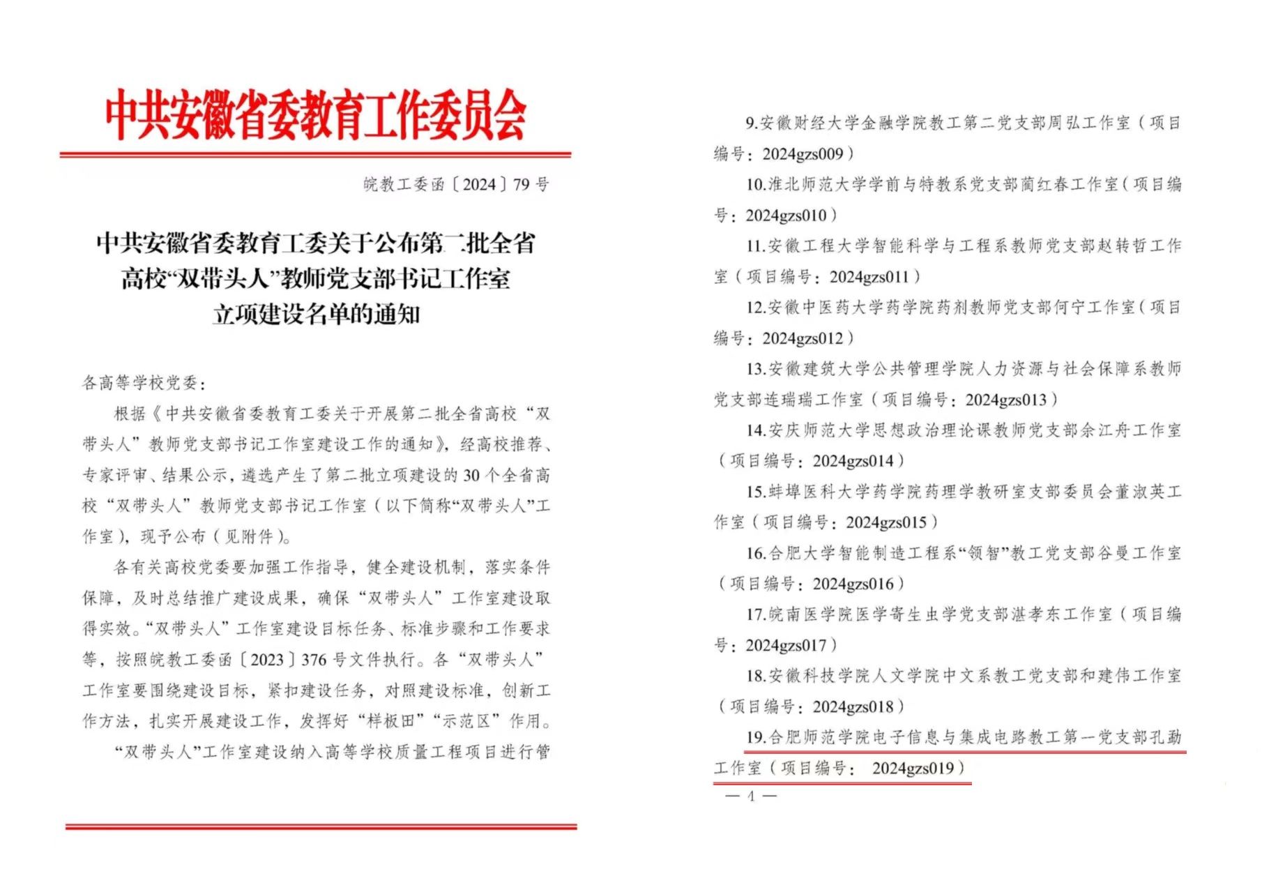 本网讯 近日,中共安徽省委教育工委发布《关于公布第二批全省高校“双带头人”教师党支部书记工作室立项建设名单的通知》,遴选建设全省高校30个 “双带头人”教师党支部书记工作室,我校Beat365亚洲版官网入口教工第一党支部孔勐工作室获批立项建设。