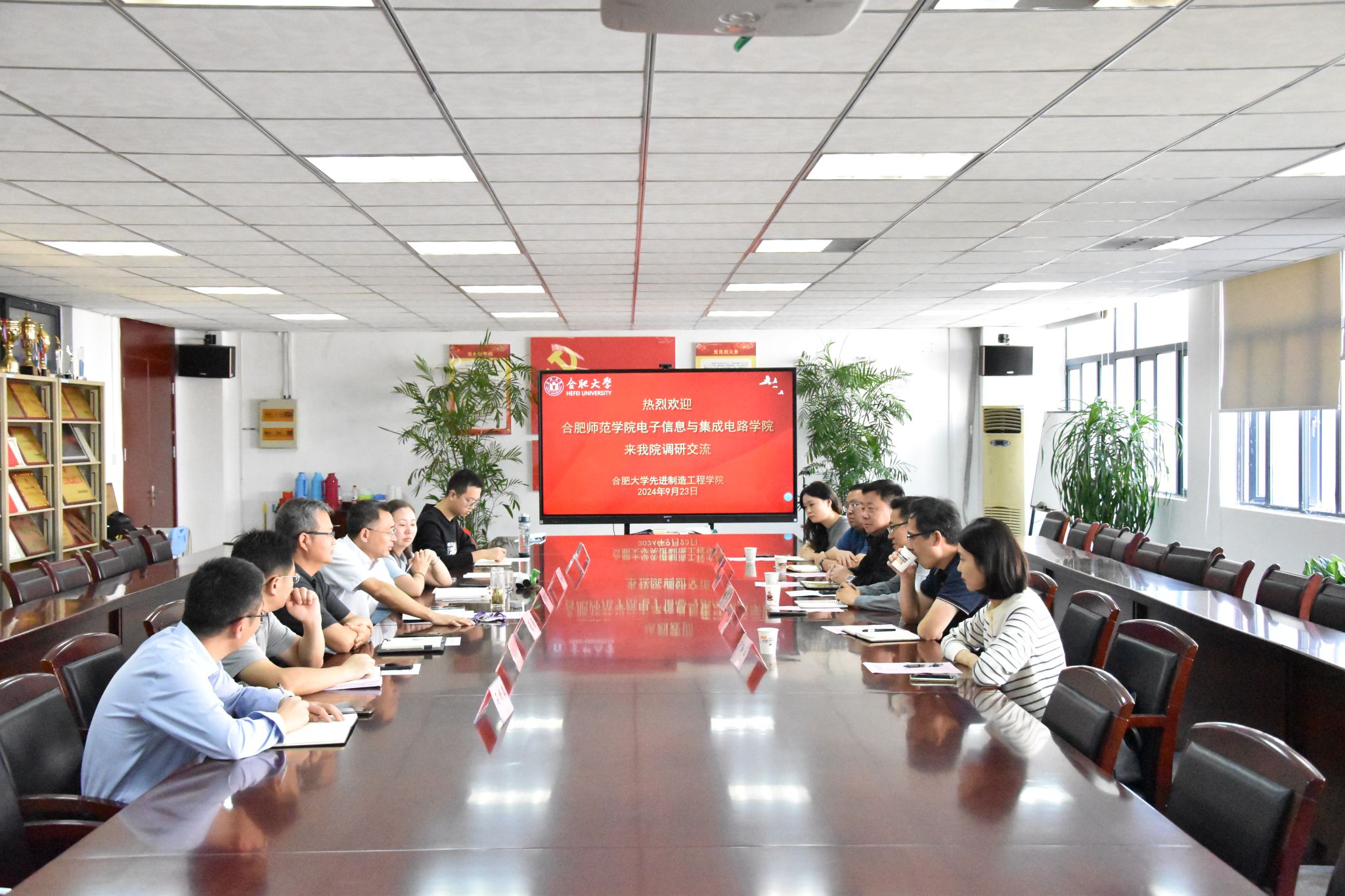 本网讯 为进一步学习贯彻党的二十届三中全会精神,认真学习全国教育大会精神,根据学校高质量发展大调研大讨论大行动的工作部署,9月23日上午,Beat365亚洲版官网入口党委书记王东明、院长张忠祥带队赴合肥大学先进制造工程学院调研学习,党委副书记胡石清、副院长范程华等参加。合肥大学先进制造工程学院党委书记杜娟、院长胡学友、副院长秦强、胡国华等热情接待了Beat365一行,双方共同召开高质量发展交流座谈会,会议由胡学友主持。