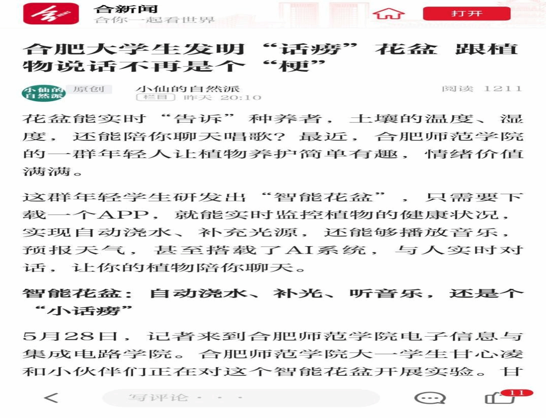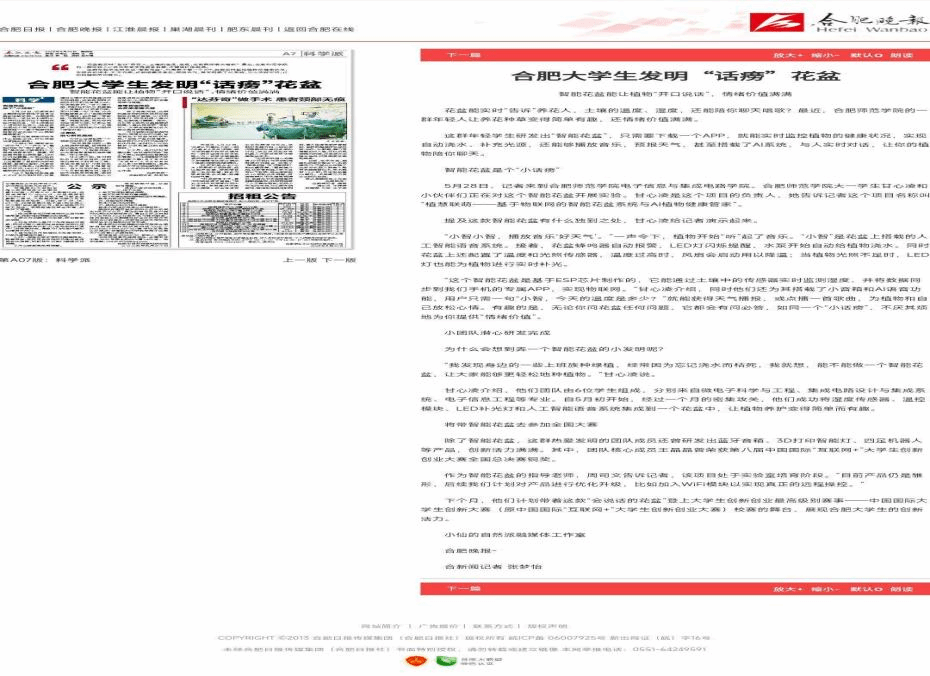 科技创新结硕果 智能花盆展风采 ——Beat365亚洲版官网入口学生项目获《合肥晚报》专题报道